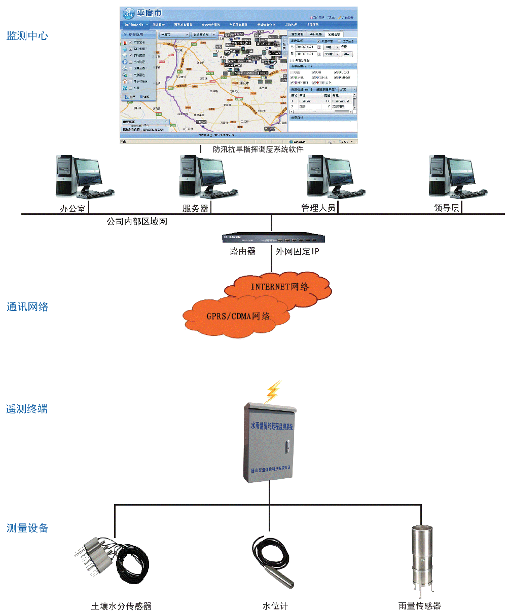 一、系統(tǒng)簡(jiǎn)介 國(guó)家防汛抗旱指揮系統(tǒng)工程是關(guān)系到我國(guó)國(guó)民經(jīng)濟(jì)可持續(xù)發(fā)展和人民生命財(cái)產(chǎn)安全的一項(xiàng)戰(zhàn)略性水利基礎(chǔ)設(shè)施建設(shè),是國(guó)家水利信息化的主體工程。該工程的實(shí)施,對(duì)于提高我國(guó)防汛抗旱指揮調(diào)度決策現(xiàn)代化水平,減輕洪澇災(zāi)害,保障人民群眾的生命財(cái)產(chǎn)安全,具有十分重要的意義和顯著的減災(zāi)效益。 二、系統(tǒng)組成 v 監(jiān)控中心:中心服務(wù)器、外網(wǎng)固定IP、防汛抗旱指揮系統(tǒng)軟件; v 通信網(wǎng)絡(luò): 基于移動(dòng)無(wú)線GPRS或電信無(wú)線CDMA網(wǎng)絡(luò); v 采集終端:水文水資源遙測(cè)終端RTU; v 計(jì)量?jī)x表:雨量計(jì)、水位計(jì)、閘位計(jì)、土壤水分傳感器; v 供電方式:電池供電、太陽(yáng)能供電、市電。